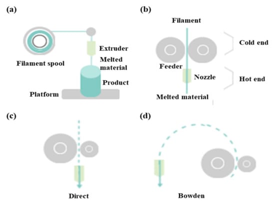 Differences between direct extruder and Bowden extruder in fused deposition modeling: (a) printing filament through an extruder, (b) distinction between cold and hot ends, (c) direct extruder, (d) Bowden extruder three-dimensional printers classified according to type and material.