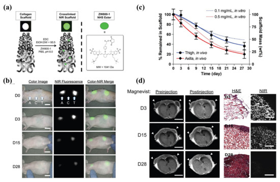 Near-infrared (NIR) fluorophore (ZW800-1)-conjugated collagen scaffold. (a) Schematic drawing of NIR scaffold preparation and chemical structure of ZW800-1 NHS ester. (b) Optical measurements of scaffold degradation by imaging NIR fluorescence over the skin. A, axilla; C, control; T, thigh, Scale bars = 1 cm. (c) Quantification of in vivo scaffold degradation in nude mice. Time course of signal changes in NIR scaffolds in animals (solid lines). In vitro test results were added as dotted lines for comparison. (d) Quantification of tissue ingrowth and scaffold degradation. (l) In vivo MR imaging of NIR scaffold implants (axilla part) with and without Magnevist. Arrowheads = implantation sites. Scale bars = 1 cm. (r) H&E and NIR imaging of resected scaffolds from (b, axilla part). Scale bars = 100 μm. Scaffold degradation accompanying tissue ingrowth was compared. Reproduced with permission from [80].