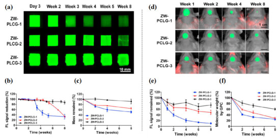 In vitro and in vivo degradation testing of ZW-PCLG copolymers. (a–c) In vitro degradation test of ZW-PLCGs with different monomer ratios. (a) NIR fluorescent images of the printed ZW-PCLG scaffolds under physiological condition. (b) Quantification of NIR fluorescence intensity remained in the scaffolds and (c) the remaining mass of the ZW-PCLG scaffolds. (d–f) In vivo noninvasive NIR monitoring for scaffold degradation. (d) NIR images of the ZW-PCLG scaffolds in the defected calvarial bone of rats at 1, 2, 4, and 8 weeks post-implantation. (e) Quantification of the remaining NIR fluorescent intensity in the ZW-PCLG scaffolds and (f) molecular weight changes measured by gel permeation chromatography (GPC). Reproduced with permission from [90].