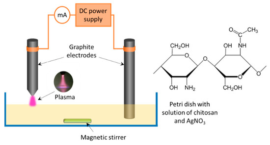 Despite extensive research on either chitosan or Ag NP solution plasma processing, only a few papers have been published on the combined plasma-based production of chitosan/Ag NP composites. For example, Ar plasma post-treatment of electrospun chitosan fibers loaded with AgNO3 led to the reduction of the latter with the formation of nm-sized Ag NPs [48]. Plasmas in liquid or in contact with liquid have also been investigated; the discharge between metal electrodes submerged in chitosan/AgNO3 solution or the gas discharge sustained between the outer electrode and liquid surface has been utilized for facile synthesis of chitosan/Ag NPs composites [49,50].
