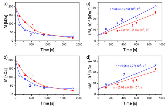 Dependencies of the viscosity average molecular mass and inverse viscosity average molecular mass of chitosan on the time of treatment by discharge with (a,c) liquid anode and (b,d) liquid cathode. 1, blank chitosan solution; 2, chitosan/AgNO3 solution.