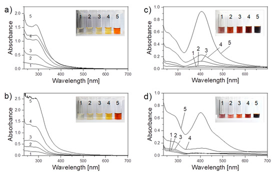 UV–VIS spectra of blank chitosan solution (left) and chitosan/AgNO3 solution (right) after the plasma processing by discharge with (a,c) liquid anode and (b,d) liquid cathode during the following: 1, 0 min; 2, 5 min; 3, 10 min; 4, 15 min; and 5, 30 min. The photos of solutions as they are attached as inserts.