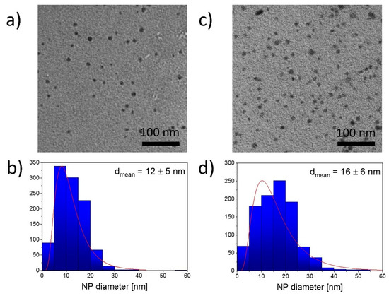 The morphology and the size of Ag NPs were determined by TEM. The TEM images of NPs, as well as their size distributions, are shown in Figure 4.