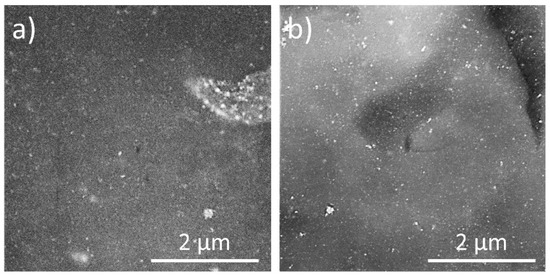 Chitosan/Ag NPs composites were produced by casting the plasma-treated solutions on glass substrates with subsequent drying. The morphology of final foils was studied using SEM measurements performed in the backscattered electron mode. As shown in Figure 5, blends prepared both with liquid cathode and anode have smooth surfaces with randomly distributed Ag NPs (bright dots).