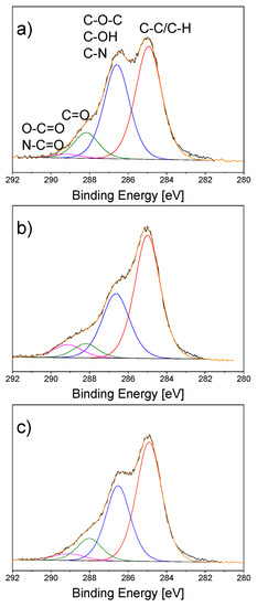 The spectrum is rich in hydroxyl, ether, and primary amine groups, all these species contributing to an intensive signal at 286.5 eV. Smaller amounts of carbonyl (288.0 eV) and carboxyl (289.0 eV) groups are also present. Plasma-solution treatment of chitosan with both polarities of the liquid electrode (Figure 6b,c) results in a decrease of the peak at 286.5 eV that occurs due to the chitosan degradation confirming the partial cleavage of glucosidic chains. Moreover, the intensification of carbonyl and carboxyl group signals has been detected. This provides evidence of the glucoside bond destruction and side oxidation reactions.