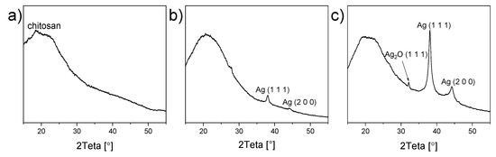 The spectrum corresponding to blank chitosan shows a broad peak with a maximum of 2θ = 20°, related to the amorphous chitosan [20] (Figure 8a). This signal is also present in chitosan/Ag NP composites (Figure 8b,c). Two extra peaks appear at 38° and 44° in these diffractograms, and they can be attributed to the Ag crystalline phase in the orientation of (1 1 1) and (2 0 0). In agreement with the earlier data, the diffraction intensity is higher for the anode than the cathode, reflecting the higher concentration of Ag NPs in the former case. Surprisingly, a weak signal has also been detected at 32°, which does not belong to any metallic silver diffraction. This peak is seen on the diffractogram for the liquid anode and is most probably concealed by background for the liquid cathode. The diffraction can be assigned to the crystalline silver oxide Ag2O in the orientation of (1 1 1) [41].