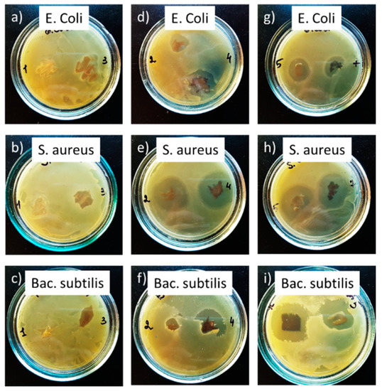 Possible biomedical applications of the prepared chitosan/Ag NP composites as elements of bandages or wound dressing materials require their strong antibacterial efficiency. Herein, the bactericidal effect of the foils was studied against the following three types of bacteria: Gram-negative Escherichia coli, Gram-positive Staphylococcus aureus, and Gram-positive Bacillus subtilis. The classic diffusion agar test was utilized, and the diameter of the zone of inhibition of bacteria growth was determined. The photos of agar plates with samples after 24 h of incubation are shown in Figure 9.
