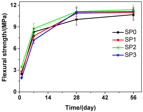 Figure 5 presents that at various curing time, the flexural strength of the tested cement paste that contains various amounts of GSNSs is different. It can be seen that as the curing time increased, the flexural strength was also on the rise. With the passage of the time, the flexural strength of SP2 was always the highest compared to that of SP0, SP1, and SP3. At the curing time of 1 day, in terms of the flexural strength, SP1 and SP2 performed better than SP0, but SP0 performed better than SP3. In terms of the flexural strength, at the 7-day curing time, SP0 performed better than SP1 and SP3, while SP2 performed better than SP0. At the 28-day and 56-day curing time, SP1, SP2, and SP3 performed better than SP0 in terms of the flexural strength. At the 1-day, 7-day, 28-day and 56-day curing time, the flexural strength of SP2 was 40.08%, 5.54%, 9.80%, and 6.45% respectively, all higher than that of SP0, just owing to the addition of 0.1 wt.% GSNSs. SP2 always performed the best at different curing time in terms of the flexural strength, which suggested that 0.1 wt.% GSNSs brought the optimal flexural strength in the tested cement paste. At the 28-day curing time, the flexural strengths of SP0, SP1, SP2, and SP3 were 10.03, 10.88, 11.12, and 11.04 MPa, respectively, suggesting an increase of 8.47%, 10.87%, and 10.07% in the flexural strength of the tested cement paste, when the contents of GSNSs were 0.03 wt.%, 0.1 wt.% and 0.3 wt.%, respectively. At the curing 28-day time, the flexural strength of the tested cement paste was higher than that of its ferro-siliceous counterpart [49]. In addition, SP1 and SP3 maintained at almost the same level in terms of their flexural strength during various curing time points.