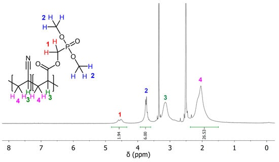 Figure 1 shows a representative 1H-NMR spectrum of a PAN-co-PDPA copolymer with all signals assigned. To determine the molar composition in the copolymer, the CH2-signals 4 in the backbone of the polymer chain were compared with the signals of the two CH3-groups 2 of the methyl esters of DPA in the copolymer. By integrating and comparing these two characteristic signals, the ratio of the two comonomer units in the copolymer was determined.