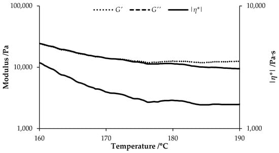 Oscillatory rheology temperature sweeps from 160 to 190 °C were measured. For melt spinning, a target viscosity of |η*| > 2000 Pa s was aimed for, ideally in the range of 200–1000 Pa s. Furthermore, the loss factor tan δ should be at least ≥ 1, indicating acceptable viscoelastic behavior of the PAN/PC mixture. While PAN F1–F4 were all outside the desired |η*| < 2000 Pa s and tan δ ≥ 1, PAN F5 met the criteria. Its temperature sweep measurement is shown in Figure 3. The value for |η*| of was <2000 Pa s in a temperature range of 170–190 °C. Its tan δ at 170 °C was 1 and decreased slightly to 0.97 at 175 °C. This can tentatively be attributed to minor PAN-degradation over time that overlays the measurement due to the slow heating rate of 1 K/min and the comparably low Tdeg of 239 °C.