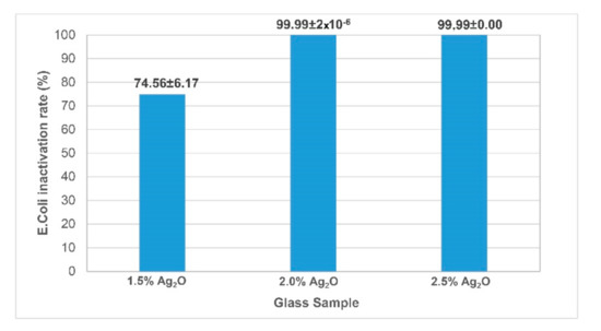 No bacterial colony was observed in the test of 2.5% Ag2O against Escherichia coli in all replicates. According to the results, inactivation rate for E. coli of 2% and 2.5% Ag2O-containing glasses was higher than 99.99% (>5 log). Esteban-Tejeda et al. [32,33] reported that a logarithm reduction higher than 3 means safe disinfection and high antimicrobial activity. Moreover, International Microbiological Criteria for Dairy Products suggested that inactivation rate for E. coli must be 99.9% in order to be account as antibacterial glassware [34]. As seen in Figure 3, inactivation rate for E. coli of 2% and 2.5% Ag2O-containing glasses is 99.99%, which is the limit criteria for E. coli according to International Microbiological Criteria for Dairy Products [34].