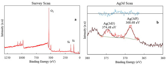In addition to XRD analysis, XPS analysis was performed to find the energy levels of silver oxide. As seen from Figure 5a, the most prominent peaks belong to oxygen and silica. The peaks in the range of 360–380 eV belong to the silver (I) oxide, and the expanded graph of this region can be seen from Figure 5b. XPS analysis results indicated that silver (I) oxide was successfully incorporated into the glass doped with 2% Ag2O. This result also confirms the antibacterial property of the glass sample since silver oxide was detected on the surface of the glass sample.