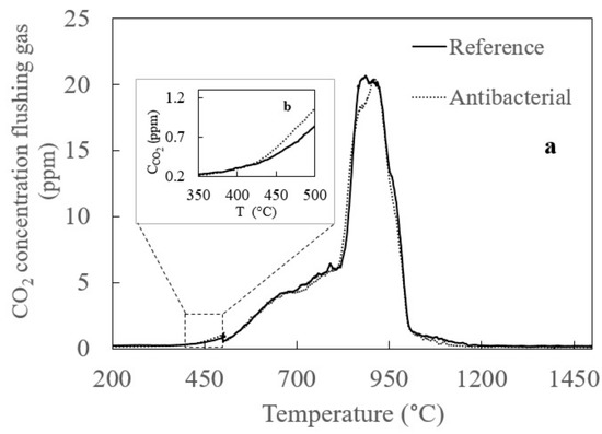 One of the originalities of this study is performing the High Temperature Melting Observation System (HTMOS) on the Ag2O-doped antibacterial soda lime glass obtained by conventional melting method for the first time. Figure 6a shows CO2 release during HTMOS measurements. As can be seen from Figure 6b that the melting reactions of antibacterial composition doped with 2% Ag2O started later than that of reference composition. In addition, according to Video 1 and Video 2 (See Supplementary Materials), the fining of the antibacterial composition doped with 2% Ag2O began slower than that of the reference glass (nonantibacterial typical container glass but also appeared to be better than the reference glass’s fining (nonantibacterial typical container glass), which can be seen from the surface of both glasses at the end of the experiment. The reason of that is the gases can reach the glass surface more easily and can be thrown out of the glass when viscosity of the glass is low.