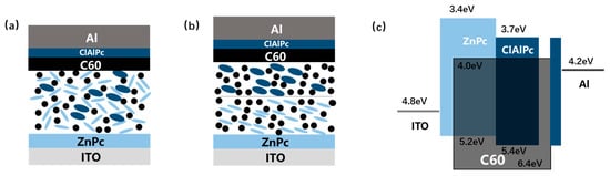 Cleaned indium tin oxide (ITO) glass is used as the substrate in all devices. Two kinds of small molecule, zinc phthalocyanine (ZnPc, Yannuo Chem., Beijing, China, purity 99%) and chloroaluminum phthalocyanine (ClAlPc, Yannuo Chem., Beijing, China, purity 99%), are used as the donors. C60 (Yannuo Chem., Beijing, China, purity 99%) is used as the acceptor. Aluminum is used as the cathode metal. These materials are used as received. All devices are fabricated in a commercial vacuum deposition system (ULVAC-KIKO VWR-400M/ERH). No other material is deposited because our deposition system has only four sites for source materials. We use ClAlPc as both donor and cathode buffer material in this experiment. The architecture of bilayer ternary devices is ITO/ZnPc/ZnPc:C60/ClAlPc:C60/C60/ClAlPc/Al. Typical photovoltaic performance is measured in the device. Figure 1b,c shows the device structure and its proposed energy level diagram. ZnPc:C60 and ClAlPc:C60 BHJs have ratios of 1:1 and 1:2, which were chosen after many rounds of optimization. All organic components are deposited onto ITO substrates at a rate of ~0.05 nm/s under a pressure of ~8 × 10−4 Pa. Al is deposited at a rate of ~0.5 nm/s under a pressure of ~5 × 10−3 Pa. The thicknesses of ZnPc (10 nm)/ZnPc:C60 (20–30 nm)/ClAlPc:C60 (20–30 nm)/C60 (15 nm)/ClAlPc (3 nm)/Al (80 nm) layers are used in this work. The film thickness and deposition rate are monitored in situ using a quartz crystal oscillator. At least three batches of photovoltaic devices are prepared under each condition. The best efficiency in each batch is mentioned in this work. A sunlight simulator (Newport Oriel 91160) is used to illuminate the sample with the power of 100 mW/cm2. The current–voltage curves are measured by an electrochemical analyzer in air. Some parameters of the measured device are extracted from the density–voltage (J–V) curves according to a one-diode model []. Optical absorption is measured with a UV-Vis-NIR spectrophotometer (Cary 5000, Agilent, Santa Clara, CA, USA) in air.