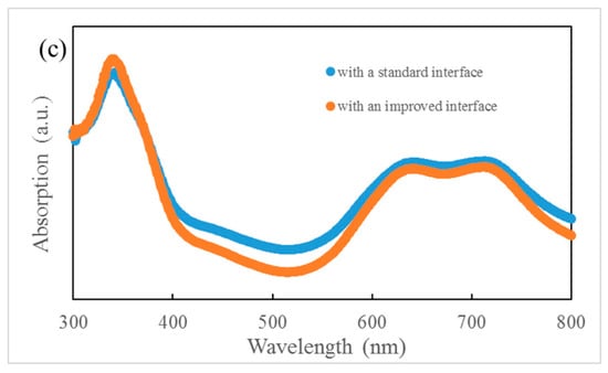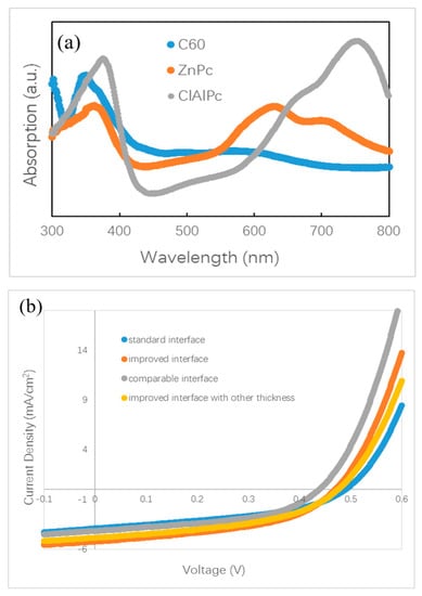 (a) Optical absorption spectra of ZnPc, ClAlPc, and C60. (b) density–voltage (J–V) curves of ZnPc:C60/ClAlPc:C60 bilayer ternary devices. (c) Optical absorption spectra of ZnPc:C60/ClAlPc:C60 bilayer with a standard or improved interface.
