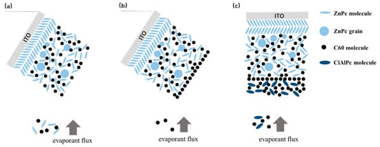 Schematically demonstration of (a) oblique deposition of ZnPc/ZnPc:C60, (b) deposition of a monolayer of C60 molecules, and (c) deposition of ClAlPc:C60 on a horizontal substrate.