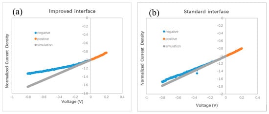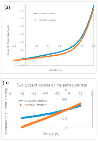 The slope of the J–V curve has been employed to study the charge loss and trap information in organic BHJ solar cells. An oblique J–V curve crossing the Jsc point usually means some charge losses due to recombination []. Simulation of oblique J–V curves reveals different kinds of voltage-dependent recombination in polymer BHJ solar cells, including geminate recombination and nongeminate recombination via traps [,,]. We analyze the J–V curve in different devices based on the result published in Ref. []. The oblique J–V curves surrounding the Jsc point in Figure 2b indicate the occurrence of voltage-dependent recombination in bilayer ternary devices. We redraw the J–V curves in Figure 4 in order to clarify the difference between the stand and improved interface. Each J–V curve is normalized to its own Jsc and divided in half at the Jsc point. The slope of the J–V curve under positive bias (0–0.2 V) is used as a benchmark for comparison with that under negative bias (−0.8–0 V). A straight grey line is drawn in Figure 4a,b by extending the J–V curve from the positive side to the negative side. Figure 4a reveals that a slight saturation trend emerges in the bilayer ternary device with an improved interface when the negative bias enlarges gradually. Such a phenomenon is common in binary BHJ devices with an oblique J–V curve under negative bias, reflecting that more charge carriers are extracted under a stronger field and that less recombination occurs inside the device [,,,]. By contrast, an almost constant slope appears in the bilayer ternary device with a standard interface under both positive and negative bias, which is shown in Figure 4b. This straight J–V curve crossing the Jsc point reveals that charge recombination in the bilayer ternary device with a standard interface is almost independent of the bias. Because these two devices are fabricated under the same conditions, except the interfacial layer between two BHJs, the different style of J–V curves under negative bias should come from the interfacial layer and indicates different degrees of charge recombination originating in the different interfaces.