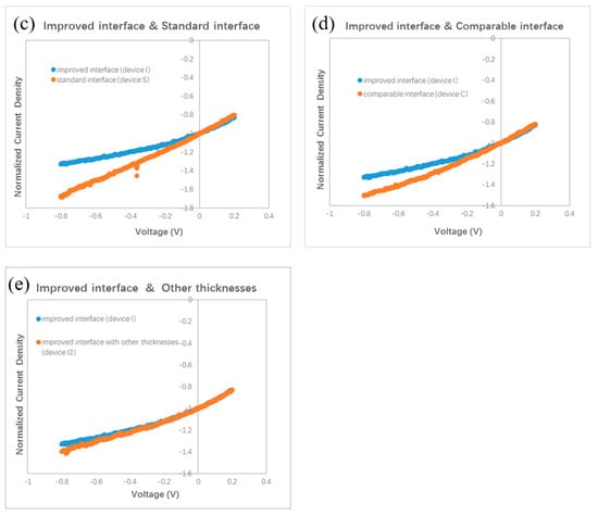 Normalized J–V curves. (a) with an improved interface, (b) with a standard interface, (c) device I and device S, (d) device I and device C, (e) device I and device I2.