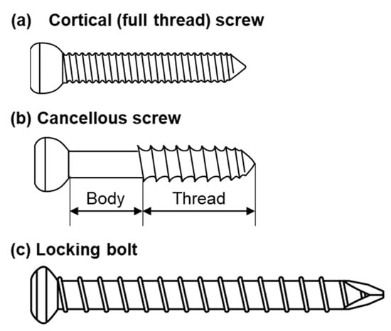Figure 1 shows the shapes of the three typical types of screw (cortical, cancellous, and locking bolts) used in this study. The following metallic screws widely used for cortical and cancellous bones were adopted for various mechanical tests. As the metallic materials for orthopedic screws, stainless steel (stainless) [11], 20% cold-worked commercially pure titanium grade 4 (C.P. Ti) [12], and Ti-6Al-4V (Ti-6-4) alloy [13] have been used worldwide. Ti-15Zr-4Nb-4Ta (Ti-Zr) alloy has been developed in Japan as a highly biocompatible alloy for long-term biomedical application [14,15,16,17,18] and it is standardized in JIS T 7401-4 [19].