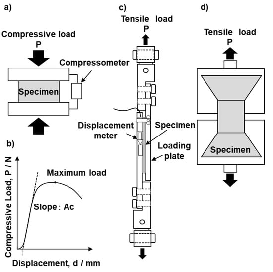 Schematic illustrations of (a) compressive test jig, (b) compressive load–displacement response, (c) tensile plate shear test setup, and (d) tensile test grip.