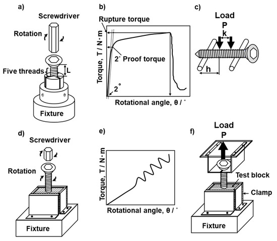 Mechanical performance tests of bone screws were conducted in accordance with JIS T 0311 [5] and JIS T 0312 [22]. Instron 8874 mechanical testing machines with motor control rotation equipment and various types of mechanical testing software were employed for experimental purposes. Figure 4a,f shows schematic illustrations of the torsional breaking and durability tests with bone screws and the driving torque and pullout tests with the bone model in accordance with JIS T 0311 [5]. In the torsional breaking test, screws were set about five threads up from the bone screw fixture subject to the screw length. Screws were also set two or three threads up from the bone screw. The screw was attached to the motor control rotation equipment, which was placed downside of the fixture, then the appropriate screwdriver was kept in the screw head so as not to apply an axial load on it. Torsional torque was constantly applied at a rate of 1 rpm until the screw broke. The torque versus rotational angle curves shown in Figure 4b were obtained by measurement. The torque was measured at a point with a rotation of 2° (2° torsional yield torque) and at the breaking point (maximum torque). To examine the effects of the core diameter and material and the screw design on the 2° torsional yield torque and maximum torque, the following cortical, cancellous, and locking bolt screws were used for the torsional breaking tests as shown in Table 1: Depuy Synthes (Tokyo, Japan), cortical 414-040, 280-990, and 480-990VS, cancellous 217-050 and 417-050, and locking bolt 459-300VS; MDM, cortical 14022-50 and cancellous 14225-50; Stryker (Tokyo, Japan), cortical OR-601050 and 1896-5050S; Zimmer Biomet (Tokyo, Japan), cortical 48-2306-050-01, 48-2319-050-00, and 00-2253-050-42; Mizuho (Tokyo, Japan), cortical 810-34, 810-36, 810-38, 810-48, and 01-810-46; Teijin Nakashima (Okayama, Japan), cortical B30and B35 and cancellous B050.