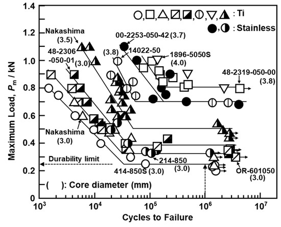 Figure 6 shows the fatigue properties of screws obtained from the four-point bending durability test. The durability performance of the metallic screws markedly changed with the core diameter, particularly between 3.0 and 3.8 mm, reaching 800 N at a core diameter of 3.8 mm. This value was twofold that at 3.0 mm. This also implies that the core diameter has a greater effect on the fatigue strength than the material. Figure 7 shows the effects of the core diameter on the durability limit obtained by four-point bending durability tests. The durability limit (D, N) increased in proportion to the core diameter (d) of the screws (D = −1413 + 577 × d, R2 = 0.97). Thus, the core diameter strongly affects the durability performance.
