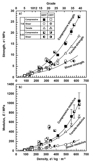 - The compressive, tensile, and shear strengths of the bone model increased with increasing density of the bone model. The strength and modulus obtained for SRPF and CRPF lay on the same straight line. Among the three strengths, the rate of increase in compressive strength with the increase in density was the highest.