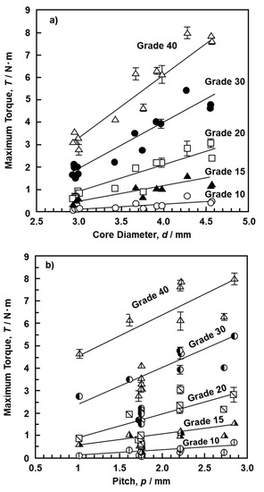 We examined the effects of the parameters related to the shape of the screw, such as the core diameter, thread diameter, height ((thread diameter – core diameter)/2), pitch, and effective surface area as newly defined in this work, on the driving torque. When the loading load in a driving torque test was small, the screw could not be screwed in. When the load was very large, the driving torque increased because the bone model was screwed despite being damaged. The screwing depth and the number of rotations were measured, and the optimum loading load was determined from the linearity between the screwing depth and the number of rotations. The optimum loading load was determined according to the density of the bone models as follows: Grades 5 and 7.5, 30–50 N; grade 10, 40–80 N; grades 12.5 and 15, 80–200 N; grade 20, 100–400 N; grade 30, 280–750 N; grade 40, 500–950 N. These values reflect the rapid changes in mechanical properties due to the increase in density shown in Figure 8. When the rotation speed was 5 rpm, the driving torque tended to increase, and the driving torque at 3 rpm was stable with little variation. Since it was found that the speed of 3 rpm was the optimum speed for driving tests, we decided to use this speed.