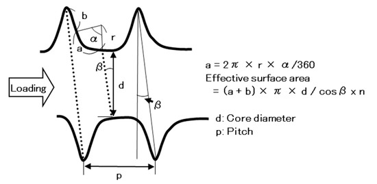 On the basis of these results, we discussed the effect of the screw shape on the driving torque. Figure 10 shows the method of calculating the effective surface area of a screw, which affects the maximum driving torque. When a load is applied from the left-hand side, the friction area of the screw that comes into contact with the bone model is considered to be the effective surface area. From the geometrical relationship, and considering that the thread of a screw is spiral, the effective surface area of one rotation of the screw is given by: