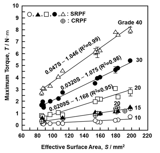 where β is the lead angle of the screw and n is the number of rotations. The lengths and angles of various parts of the screw (b, d, r, α, and β in Figure 10) were measured under an optical microscope to obtain the effective surface area per rotation of the screw. The a is given by a = 2π × r × α/360. Figure 11 shows the relationship between the effective surface area calculated using Equation (1) and the maximum driving torque. Figure 11 shows data obtained using the S-bone and the 17 screws described in Section 2.4. When the effective surface area for both SRPF and CRPF bones was increased, the maximum driving torque increased linearly. It is clear from Figure 11 that grade 15 SRPF and grade 20 CRPF lie on the same straight line. The following equations hold between the maximum driving torque T (N·m) and the effective surface area S (mm2) for various densities of the bone model.