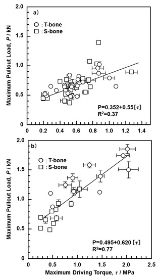 Relationship between maximum pullout load and maximum driving torque with (a) SRPF grade 15 and (b) CRPF grade 20.