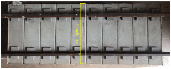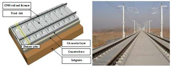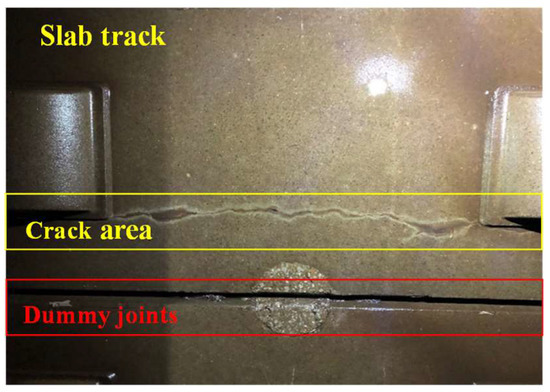 Longitudinally coupled prefabricated slab tracks (LCPSTs) are widely used in the new high-speed railway (HSR) lines in many countries, such as Germany, Japan, and China. In China, for instance, it accounts for about 35% of the total length of the national HSR network. LCPST is a multi-layer structure composed by concrete track slab, cement asphalt (CA) mortar layer and concrete base. The concrete slab is prefabricated and dummy joints are adopted to prevent concrete crack and its expansion, as shown in Figure 1 [1,2]. However, the practical experience of HSR operation in various countries shows that with the increase of the service time of the rail line, the performance of the track slab deteriorates significantly, and structural defects such as cracks and deformation of track slab can inevitably appear gradually [3]. Under the combined effect of temperature, rainwater, and dynamic load of reciprocating train, these cracks can aggravate the concrete looseness and water seepage near the cracks, lead to the corrosion of the internal reinforcing bars, and significantly reduce the service durability and stability of track slab structure [4,5]. With the continuous increase, expansion and penetration of the cracks, the integrity of track slab can be damaged, which directly affects the dynamic response characteristics of track structure, and even becomes the main hidden danger seriously threatening the operation safety of HSR [6]. How to detect the crack of track slab timely and effectively has become an important problem to be solved in the maintenance of HSR ballastless track.