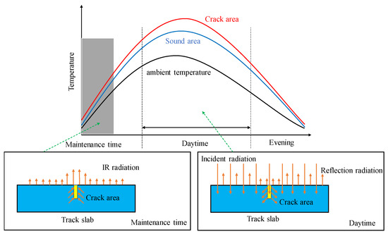Any object with a temperature higher than absolute zero will continuously radiate infrared light to the external environment. Because the surface temperature and thermal physical parameters of the objects are different, the ability of the objects to radiate infrared light to the external environment is also different. The higher the temperature of the object, the stronger the ability of infrared radiation to the external environment. IRT, as a novel NDT technique, can detect the different intensity infrared thermal waves emitted by object surface and convert them into infrared thermal images with different colours [25]. For track slab, when a crack appears on its surface, a significant difference between the thermal conductivity of air medium in cracks and that of concrete materials will generate. When the heat flow enters the crack, the heat will accumulate in the crack area; when the heat flow exits, the air medium in cracks slows down the heat dissipation, resulting in the temperature difference of crack area and non-crack area, which generates temperature gradient field (see Figure 3). With IRT, we can detect the surface crack of track slab by collecting such temperature difference.