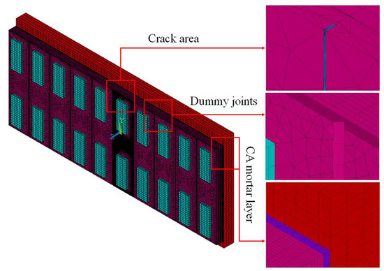 Based on the actual slab scale, a three-dimensional FE model of IRT detection of track slab with surface through cracks is established, in which Solid 70 element is used to simulate track slab, sleepers, CA mortar layer, and concrete base. The slab is 20 cm thick, 6.45 m long, and 2.55 m wide, supported by 10 sleepers (0.8 m × 0.3 m × 0.07 m), with V-shape dummy joints equally spaced between each sleeper at 0.65 m interval. The size of CA mortar layer and concrete base are 6.45 m × 2.55 m × 0.03 m and 6.45 m × 2.95 m × 0.3 m, respectively. Bonding treatment is adopted between layers to ensure connection. According to the investigation results in Table 1, through crack is set at the 5th sleeper. With Boolean operation, the actual irregular cracks are simplified as regular cracks with rectangular cross-section, and mesh refinement is adopted for crack area, as shown in Figure 4. The main calculating parameters are summarised in Table 2.