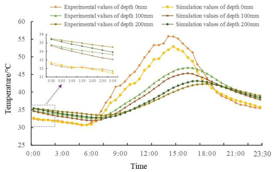 From Figure 5 that there is an error between the measured and the simulated value, especially at the slab surface (0 mm), and the maximum difference is 4.14 °C. This is due to the simplification of the boundary conditions in the FE model, in which the thermal effect caused by the direct solar radiation on the slab surface is ignored. During the period of window time for maintenance, the overall difference between the measured value and the calculated value in different depths is small, among which, the maximum difference between the two is only 0.25 °C on the slab surface and 0.58 °C at the depth of 200 mm, the boundary between track slab and mortar layer. The explanation for the difference at 200 mm is that the detection model simplifies the actual three-dimensional heat conduction process into one-dimensional and that the conductivity is different between slab and CA mortar layer.