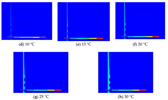 Taking crack with 0.2 mm width as an example, Figure 7 shows the colour map of through crack under different temperatures. As ambient temperature increases, the temperature of the crack edge increases, and it spreads to the non crack area, resulting in a larger zone of detectable temperature area. Besides, under the influence of sleeper’s conductivity, the temperature difference zone along the crack direction becomes unstable on the side of the sleepers, while on the other side it is uniform.