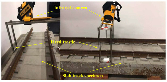 The field test is carried out in an HSR (Sifang Ltd, Qingdao, China) section to detect the potential slab cracks using the same IRT equipment as in the laboratory test. During the test, the ambient temperature is 25.1 °C, the wind speed is 0.1 m/s, and the surface temperature of track slab is 32.78 °C.