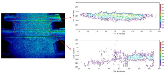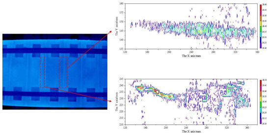 To extract the feature of the surface crack area in Figure 10, we use the temperature field isotherm method [40] and the result is shown in Figure 11. At the surface crack area and the dummy joint area, there is a long high temperature envelope area in the isotherm diagram. The isotherm trend of the same dummy joint is roughly the same, only different in amplitude and background noise. By using the relative position relation and calculating the crack area according to the isotherm diagram, we can identify that the maximum crack width is 0.32 mm and the minimum crack width is 0.1 mm. Through the multi-point sum calculation, we can obtain the area value of 61.15 mm2, compared to the actual value of 66 mm2, with error of 7.35%. The performance is validated by applying IRT to crack detection with respect to crack area and width.
