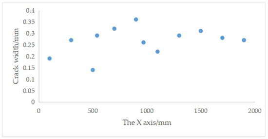 Figure 12 shows a typical through crack on the surface of track slab. The maximum, minimum and average crack width are 0.36 mm, 0.14 mm, and 0.27 mm, respectively. They are measured by a portable crack detector. The temperature range of the IRT equipment is set as 15–36.5 °C, and the shooting range is set as 3/10 of the track slab. Figure 13 shows the thermal image.