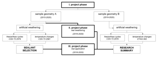 To summarize the scope of the presented research, it was divided into three phases, as can be seen in the simplified diagram in Figure 2. Depending on the research phase, different sample design and/or weathering/aging method was used.
