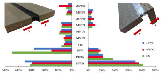Before the commencement of the tensile test, a normalized value was calculated for all tested representatives. The normalized value is a simple parameter that can show whether a relative shrinkage/elongation of the tested joint has appeared during its curing period and/or after conditioning. In general, the normalized value was usually around ±2% of the original joint width, no matter the type of sealant or conditioning method, i.e., laboratory or real environment. In case of PU sealants, the min and max shrinkage/elongation was around 8% which is approximately 0.92 mm. The average joint width of PU joints before the tensile test was (11.54 ± 0.35) mm. The 8% value appeared only occasionally, namely in three cases. Therefore, the impact of the environment on joint shrinkage/elongation was irrelevant. More interesting data were observed with MS sealants where even 15% shrinkage of the joint was monitored. The average joint width of MS sealants was similar to PU representatives, it was around (11.08 ± 0.61) mm. The impact of conditioning on sealed joint shrinkage was observed regularly, the most critical was the exposure of the joint to the real environment for 4 years. Representatives MS/1/1 and MS/1/3 were impacted the most. The average joint width was (9.51 ± 0.41) mm. Similar data were observed in combination with an STP sealant that was subjected to freeze–thaw cycles. Compared to the reference set, the joint width shrank by 9%.