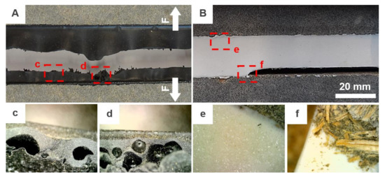 As can be seen in Figure 4, the most critical drop of tensibility was observed in combination with PU/2 after conditioning to variable temperature changes. The tensibility was reduced by more than 65%. Unlike PU/1/1, this representative of the PU group is not bubble free product which was very often a cause of premature cohesive failure (see Figure 5a), moreover, as observed by, e.g., Banea et al. [32], the worsening of strength and elongation properties of PU adhesives/sealants caused by elevated temperature is quite common. The impact of weathering was also confirmed by the results of performed ANOVA. The p-value smaller than 0.05 was obtained for both conditioning methods when compared to the results of the reference set. On the contrary, this phenomenon was not observed with sample geometry design B. Nevertheless, the average elongation of the joint was almost two times smaller.