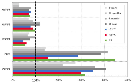 In the II project phase, i.e., determination of the impact of the real environment on the sealed joint durability, only five representatives from the presented group of sealants were tested. These were PU/1/1, PU/2, MS/1/1, MS/1/2 and MS/1/3. As already mentioned above, the STP and MS/2/2F were excluded from a further research due to their inappropriate properties for the studied application area. The data of tensibility presented in Figure 7, demonstrate that the additional tests performed in a real environment were very beneficial from a long-term perspective. The most crucial data were recorded in combination with the PU/2 sealant. When compared with the reference set, the one-way ANOVA showed a significant impact of the environment in all tested periods. The relative elongation of the joint dropped by more than 62%, i.e., from 445.61% (author’s note: unconditioned reference set) to 138.75% after 1-year exposure. A similar pattern was observed in combination with MS/1/3. Even though, an increase in tensibility was monitored after 14 days and 6 months, the tensile properties of samples tested after 1 and 4 years were deteriorated and dropped by more than 60% (i.e., from 76.31 to 28.05%). In the case of the sealants MS/1/1 and MS/1/2, the observed changes were not so considerable. Moreover, samples cured in an outdoor environment showed better tensile properties than those tested only in a laboratory.