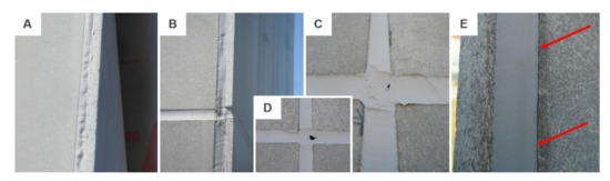Examples of failure modes: (A,B) extrusion found on the south-east façade; (C,D) softening found on the front façade; (E) adhesive failure.