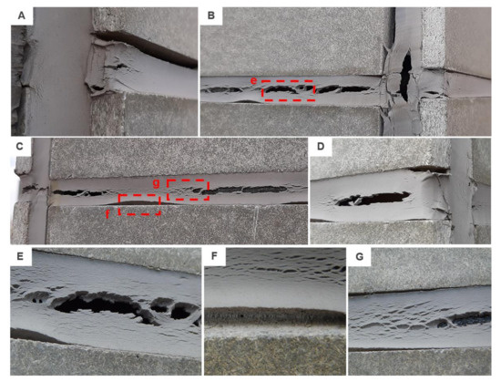 Examples of failure modes monitored after 4 years: (A) adhesive failure to the substrate in combination with crazing; (B) south-east façade and (C) north-west façade with cohesive failure caused by hardening as well as softening of the sealant; (D)–(G) details of observed failures.