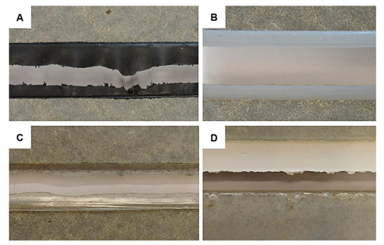 On the other hand, excellent resistance to artificial aging of silane terminated polymers (STP) and silyl modified polymers (MS polymers and/or SMP) was reported throughout the last decade [18,19,20,21,22,23,24]. Modified polymer sealants should be an efficient and environmentally friendly alternative to sealants based on polyurethane. Still, Bitenieks et al. [21] stated that not only can the curing period vary widely depending on the type of MS Polymer but also the kinetics of cross-linked network formation of various products can considerably affect the mechanical properties of the selected systems. The results of our project reported above support this conclusion as well. Thus, seven representatives from three different manufacturers were tested to prevent some of the mentioned problems and also to find the most suitable solution for the tested cladding material.