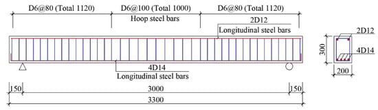 To study the influence of different factors on the time-dependent behavior of RAC beams, 16 beams were designed and manufactured in accordance with the requirements of GB 50010-2010 [39], and the dimensions and reinforcement of the specimens are shown in Figure 1. The size of the specimen was 200 mm × 300 mm × 3300 mm, and the spacing between the supports was 3000 mm. Two longitudinal bars with diameters of 12 mm were arranged at the upper end of the beam, and four longitudinal bars with diameters of 14 mm were arranged at the lower end; the reinforcement ratio of the beam was 1.4%, which is common in engineering. The diameter of the hoop reinforcement was 6 mm, and the cover depth of reinforcement was 20 mm. The number of specimens and the actual stress ratio are shown in Table 1. In Table 1, D represents RAC with a design strength of 40 MPa, which is called moderate strength concrete; G represents RAC with a design strength of 60 MPa, which is called high strength concrete; H represents a stress ratio of the specimen that is higher than 0.4, which is called a high stress ratio; L represents a stress ratio of the specimen that is less than 0.4, which is called a low stress ratio; 100/50 represents a 100% replacement rate of RCAs and a 50% replacement rate of RFAs, and the rest are similar; M is the actual bending moment due to loading; My is the yield bending moment; and M/My is the actual stress ratio. The replacement rate of RCAs is 0%, 33%, 66%, and 100%, and the replacement rate of RFAs is 0%, 50%, and 100%, which is commonly used in research.