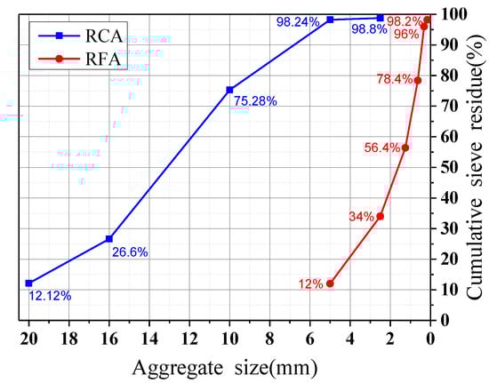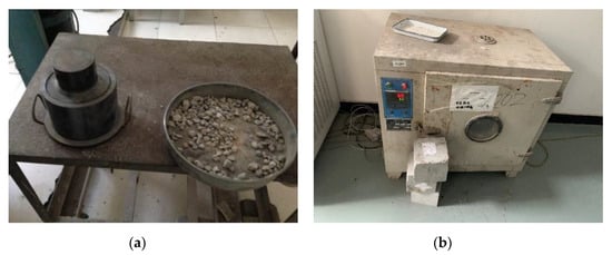 Photographs of the aggregates adopted in the experiment are shown in Figure 2. The natural coarse aggregates (NCAs) used in the test came from mountain gravels, and the natural fine aggregates (NFAs) came from river sands, with a fineness modulus of 2.6. The recycled aggregate came from a demolished concrete structure with over 20 years of service in Beijing. After sieving, aggregates with a particle size of 5–25 mm were used as recycled coarse aggregates (RCAs), and aggregates with a particle size of 0.16–5 mm were used as recycled fine aggregates (RFAs). The particle size distribution test results of the RCAs and RFAs are shown in Figure 3. According to the requirements of GB/T 14684-2011 [40], GB/T 14685-2011 [41], GB/T 25176-2010 [42], and GB/T 25177-2010 [43], the basic properties of the aggregates are shown in Table 2. Some of the instruments used for measuring the basic properties of the aggregates are shown in Figure 4.