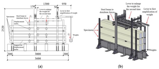 In the past, the loading equipment for long-term studies was either directly loaded with heavy objects or loaded with springs or simple primary levers [25,26,27,28,29,33,34]. This leads to either the volume being too large or the device being too complicated. Therefore, aiming at solving this problem, a secondary lever loading device was designed and used for this study. This loading device is a self-balancing loading system, which is loaded by the primary lever and secondary lever for amplification, and the weight can be increased by 171 times. In the design, the lever is set in the upper space of the beam, which effectively reduces the occupied area of the arm. This loading device can load multiple concrete beams in a small test site, and the loading device is shown in Figure 5. A large amount of space can be saved by using the secondary lever loading device. A large loading force can be obtained by using a smaller loading weight compared to that of previous loading methods, and the loading is stable. The amount of weight can be adjusted at any time to obtain the required loading force. By arranging the force sensor on the upper end of the distribution beam, the exact value of the actual loading force can be obtained at any time by manual data collection. The dial indicators are arranged at the loading point of the beam span and the three-point loading point. Through manual measurement of dial indicator readings, the deflection values of the beam in the middle span and the deflection value of three stress points of simply supported bearing at both ends are obtained.