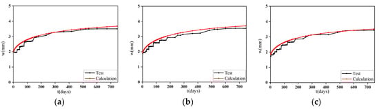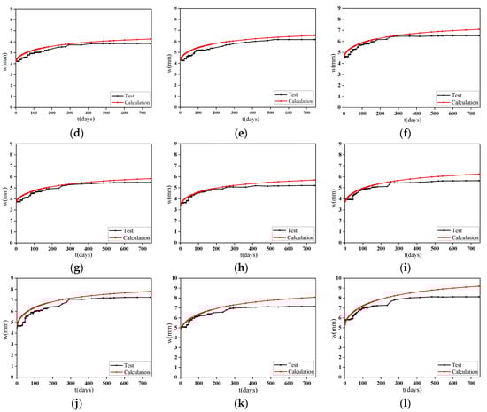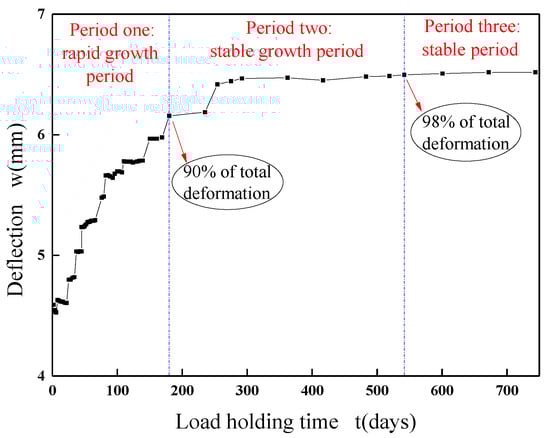 Combined with other specimens, the time-dependent behavior process of the RAC beams can be approximately divided into three periods. The first period is the rapid growth period of time-dependent behavior, which occurs in the early stage of loading. During this period, the age of the beam is relatively young, and the deflection generated by shrinkage and creep is large, so the midspan deflection increases rapidly. During this period, the deflection of the beam can reach 90% of the total deflection in the test. The second period is the stable growth period of time-dependent behavior, which lasts from 180–540 days of loading. During this period, the shrinkage and creep increment of the RAC slow down, the deflection growth rate of the beam decreases gradually, and the deflection of the beam can be approximately 98% of the total deflection in the test. The third period is the stable period of time-dependent behavior, which takes place after 540 days of loading. During this period, the shrinkage and creep of the RAC tend to be stable, with little change.